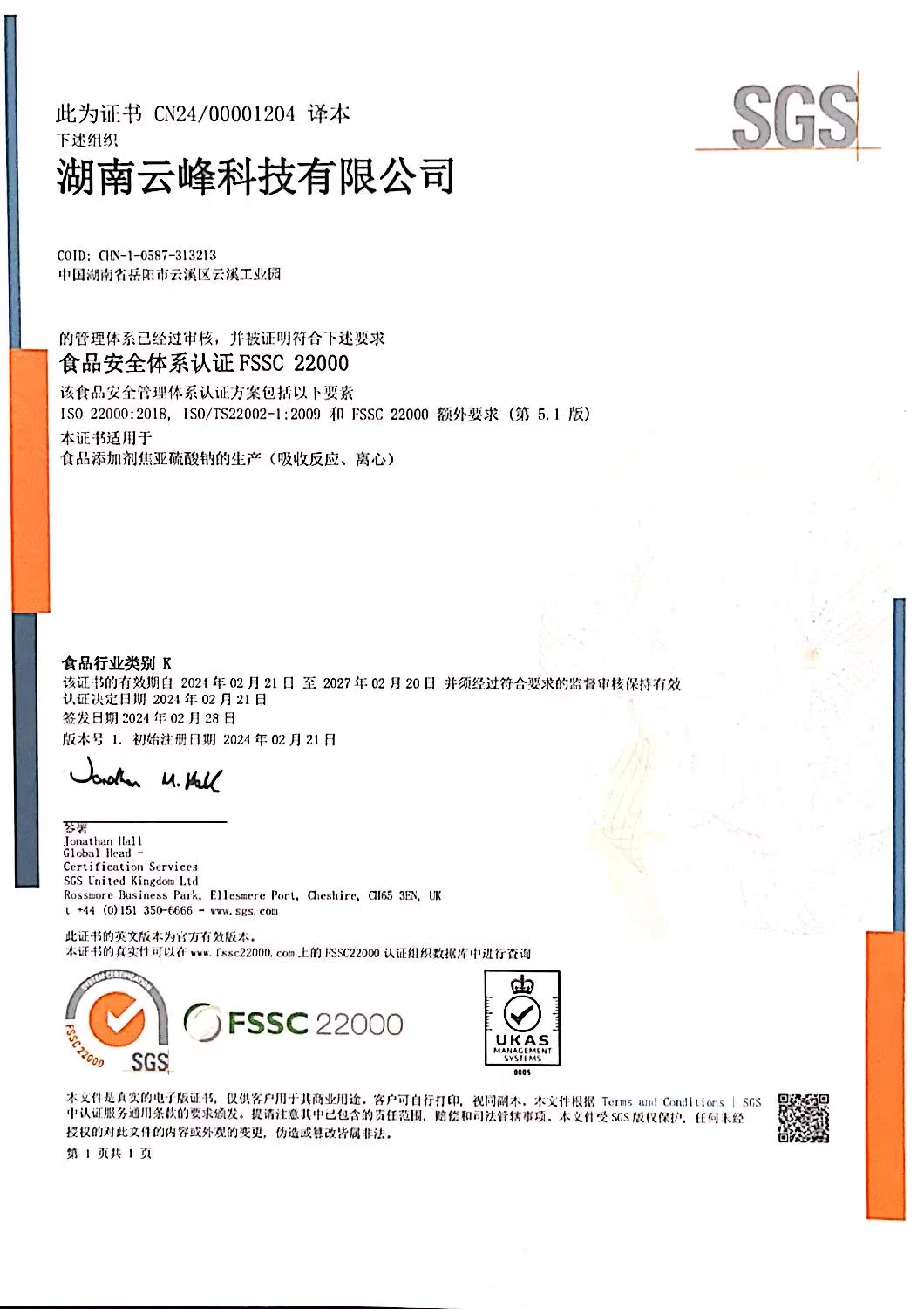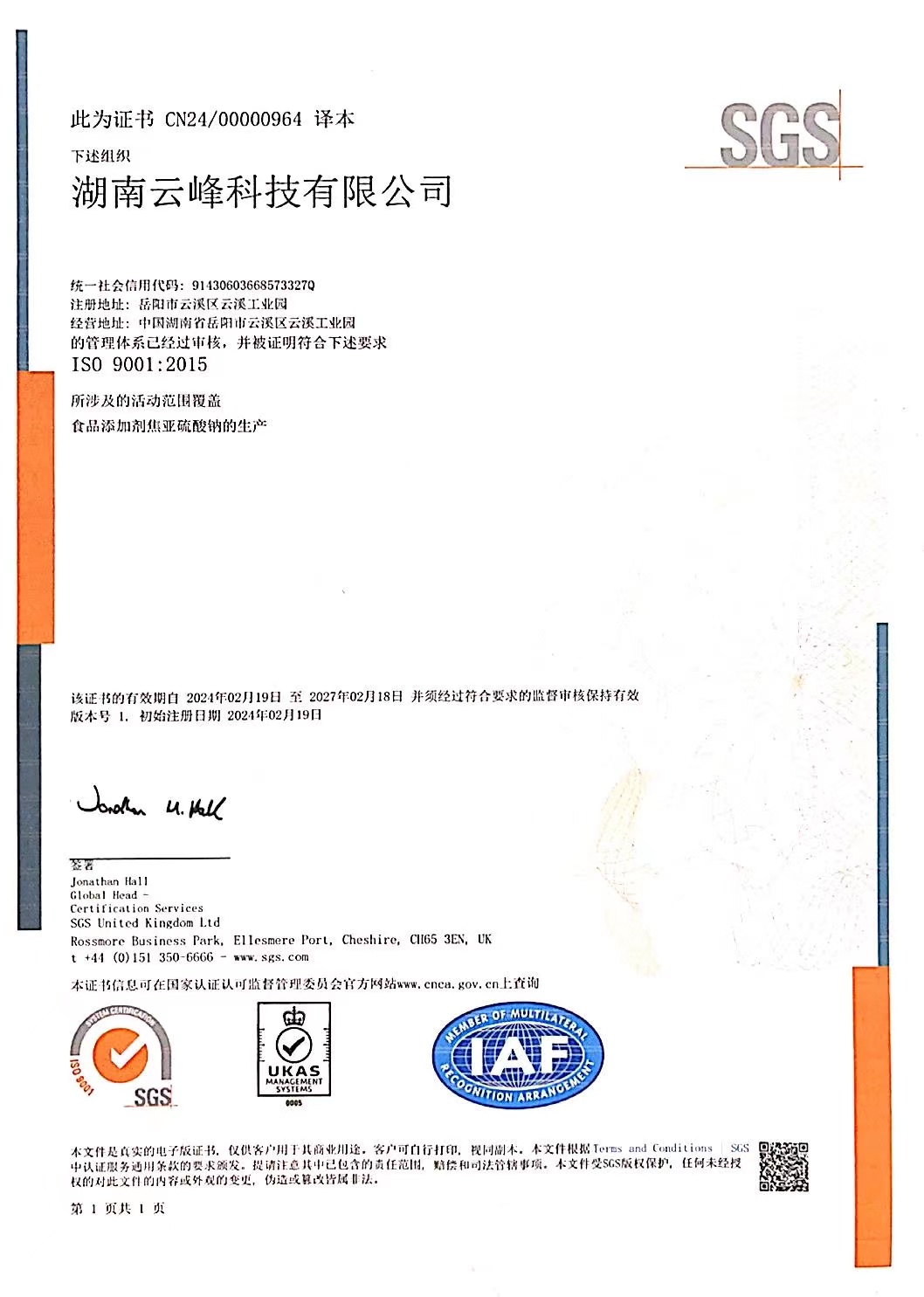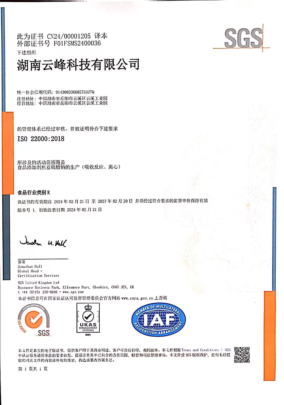 湖南云峰科技有限公司(以下簡稱云峰科技),是由長沙湘岳化工責任有限公司全額投資以生產(chǎn)焦亞硫酸鈉、亞硫酸鈉等亞硫酸鹽為主營業(yè)務的高科技企業(yè),具有六十多年的生產(chǎn)歷史,同時也是焦亞硫酸鈉的國家標準制定參與者。在行業(yè)內(nèi)具有很大的影響力?,F(xiàn)有職工八十余人。具有優(yōu)良的經(jīng)營管理團隊和成熟的生產(chǎn)技術隊伍。由多位在化學、化工行業(yè)擁有豐富工作經(jīng)驗的工程師及技術員團隊組建而成,致力于亞硫酸鹽產(chǎn)品的研發(fā)、生產(chǎn)和銷售。2020年公司對生產(chǎn)設備、安環(huán)設施及工業(yè)技術等進行了大規(guī)模的升級改造,使焦亞硫酸鈉和亞硫酸鈉的生產(chǎn)工藝更加先進,技術更成熟,產(chǎn)品質(zhì)量更優(yōu)良。無論在生產(chǎn)工藝、設備、產(chǎn)品質(zhì)量、清潔生產(chǎn)、節(jié)能環(huán)保和員工素質(zhì)方面,均處于行業(yè)領先地位。公司的主導產(chǎn)品“云峰”牌焦亞硫酸鈉,歷史悠久,深受國內(nèi)外客戶信賴,產(chǎn)品遠銷東南亞、歐美、非洲、南美洲等20多個國家和地區(qū),產(chǎn)品供不應求。